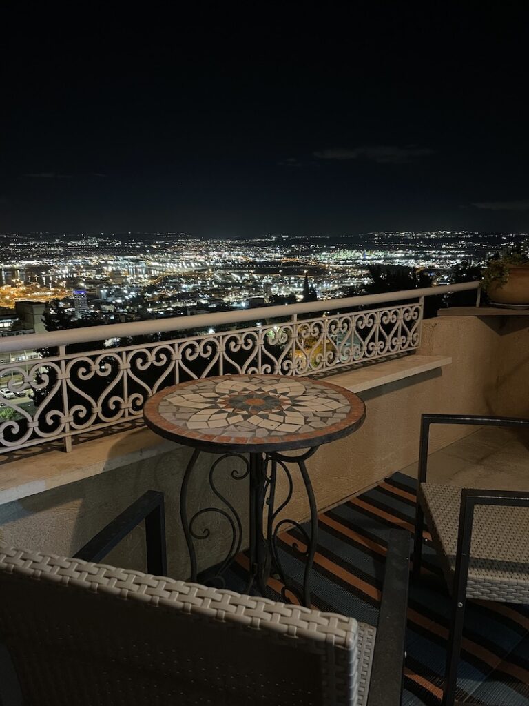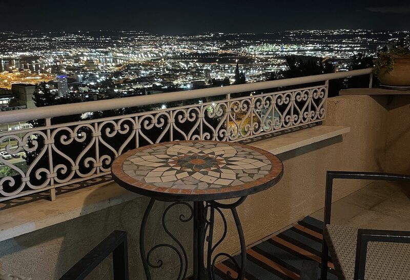 Og faktisk havde vi god tid til det hele. Vi boede i en skøn airbnb-lejlighed med udsigt over Haifa, og vi fik både skønne svømmeture og gode traveture. En af dagene var vi ved stranden om formiddagen og om aftenen spiste vi på en af Haifas mest julepyntede gader. Så vi må igen konstatere, at vi får mange gode oplevelser med i købet ved at have sagt ja til opgaven med at være præstepar i Jerusalem.
