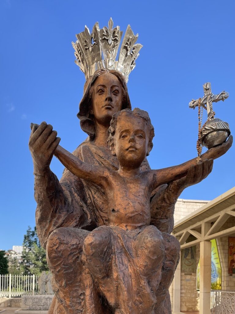 Da vi var i Nazaret besøgte vi naturligvis bebudelseskirken. Der var meget at se på, og vi gik blandt andet rundt og så de mange forskellige kirkesamfunds fremstillinger af Jomfru Maria. Det var virkelig tankevækkende at se, hvor forskelligt hun fremstilles i forskellige kulturer. Den stærkeste fremstilling var for mig en skulptur af Jomfru Maria med Jesusbarnet på skødet. Jesus sidder med et scepter i hånden som et symbol på kongeværdigheden.