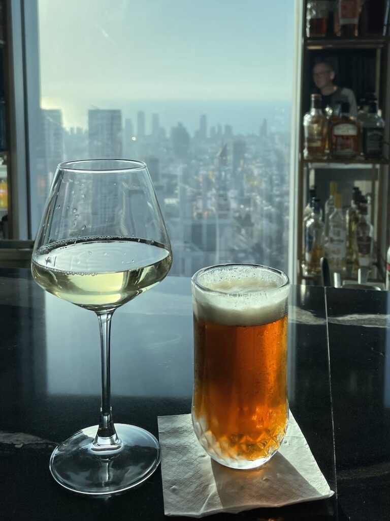 Ud over cirka 40 kilometers vandring rundt i byen (gennem markeder, gennem Bauhaus-arkitektur, gennem højhus-kvarterer og gennem det gamle Jaffa) fik vi også tid til at besøge kunstmuseet, hvor der var en særudstilling med den jødiske kunstner Reuven Rubin – og vi fik tid til stop ved diverse cafeer. Den smukkeste udsigt fandt vi på Azrieli Center på 49. etage. Observatoriet var desværre lukket, men vi nød at sætte os med en glas i baren – og lade nogle af indtrykkene fæstne sig.